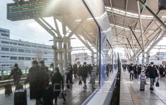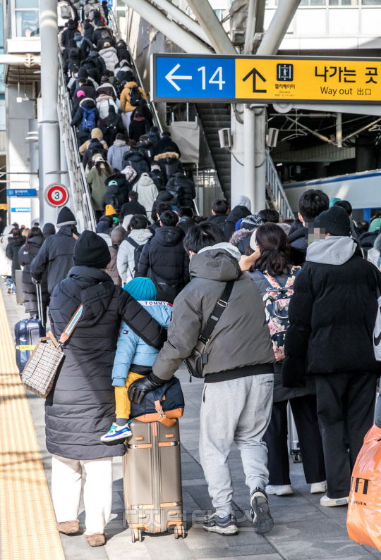 설 연휴 마지막 날인 24일 서울역에 도착한 귀경객들이 발걸음을 옮기고 있다.