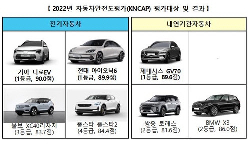 2022년 KNCAP에서는 니로EV가 90.0점으로 가장 높은 점수를 받았다. 이어 아이오닉 6(89.9점)와 GV70(89.6점)이 1등급을, 쌍용차 토레스(81.6점)와 BMW X3(86.0점)가 2등급을 획득했다.