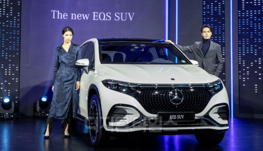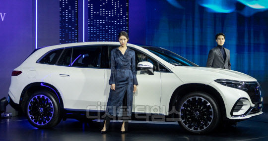 1일 용산구 그랜드 하얏트 서울 호텔에서 열린 메르세데스-벤츠 전기 SUV '더 뉴 EQS SUV' 국내 출시 행사에서 모델들이 더 뉴 EQS 580 4MATIC SUV 차량과 함께 포즈를 취하고 있다.