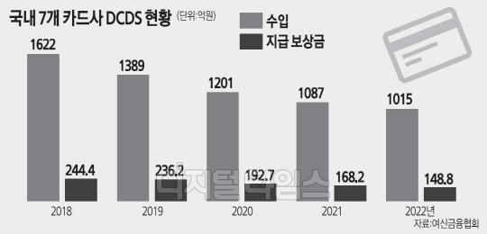 16일 카드업계에 따르면 지난해 신한·삼성·KB국민·하나·BC카드 등 주요 카드사들이 DCDS로 벌어들인 수수료는 1015억원으로 집계됐다. 전년 동기 대비 6.6% 감소했는데, 신규 가입이 중단된 2016년 이후 가입자 수가 매년 줄면서 수수료도 줄어들고 있다. DCDS 통계가 공시되기 시작한 2015년 332만명에 달했던 가입자 수는 지난해 109만명으로 3분의 1 가량 줄었다.