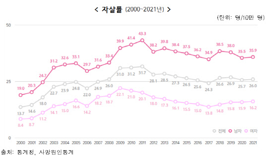 20일 통계청이 발표한 '국민 삶의 질 2022' 보고서에 따르면 재작년 우리나라 자살률은 전년 대비 0.3명 증가한 26.0명으로 집계됐다. 자살률은 2000년 13.7명에서 2011년 31.7명으로 늘어난 이후 감소세로 접어들었으나, 2017년부터는 다시 증가하고 있다. 성별로는 여자(16.2명)에 비해 남자(35.9명)의 자살률이 2배 이상 높았다. 다만 여자의 자살률도 2017년(13.8명) 이후 증가하고 있다.