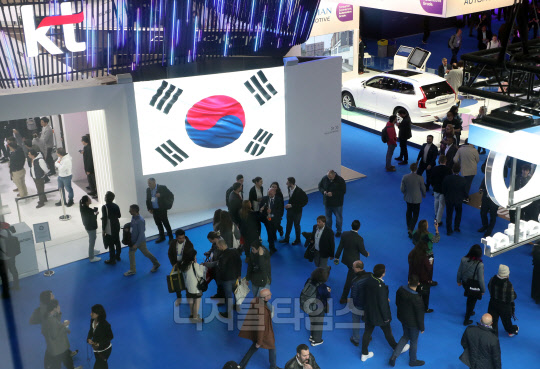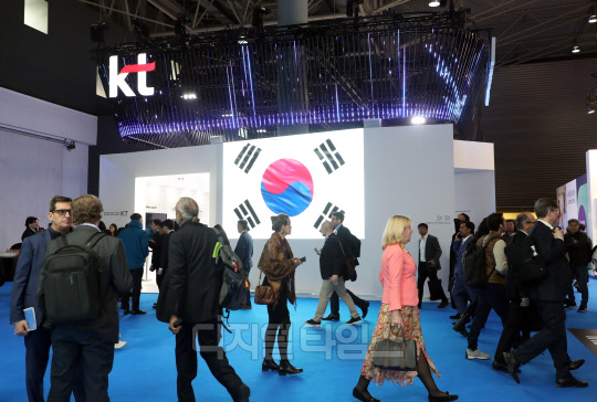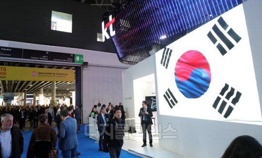 28일(현지시간) 세계 최대 이동통신 전시회 모바일월드콩그레스(MWC 2023)가 열린 스페인 바르셀로나 피라 그란 비아 전시장 내 KT 부스에 삼일절을 앞두고 대형 태극기 영상이 상영되고 있다.