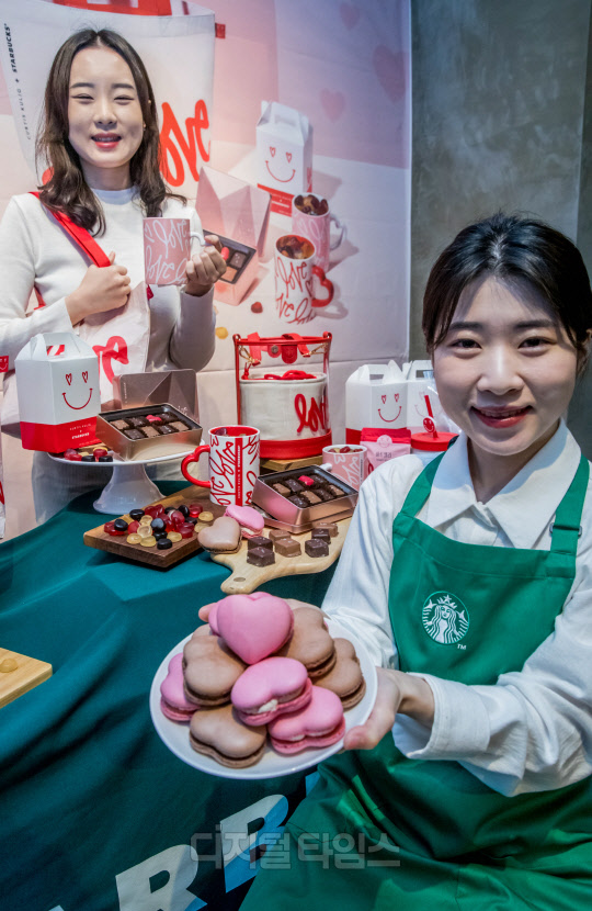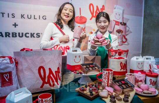 9일 서울 중구 스타벅스 한국프레스센터점에서 모델들이 커티스 쿨릭의 'LOVE' 아트웍을 활용한 화이트 데이 푸드와 MD 등을 소개하고 있다.