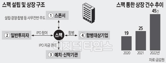 금융감독원이 9일 공개한 최근 스팩을 통한 기업공개(IPO)·합병 동향 자료에 따르면 스팩을 통한 증시 상장 건수는 지난해 45건으로 2021년(25건)보다 80% 늘었다.