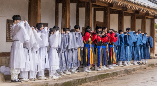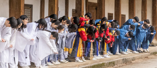 12일 서울 종로구 성균관대학교에서 열린 '2023 신방례(新榜禮)'에서 신입생과 재학생들이 상읍례(相揖禮) 동작을 선보이고 있다. 신방례는 조선시대에 과거에 합격한 유생들을 위한 환영식이자, 선배들이 신입 유생들을 대상으로 치렀던 일종의 통과의례다.