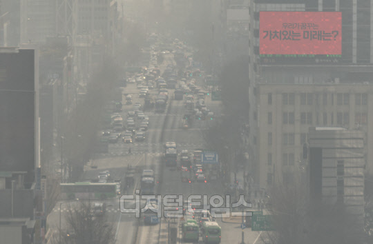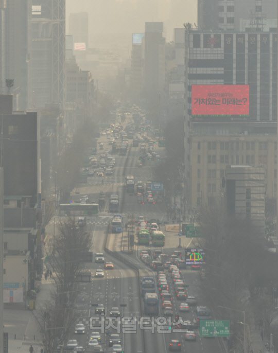 수도권에 미세먼지 비상저감조치가 발령된 20일 서울 도심이 뿌옇게 보이고 있다. 기상청은 이날 전국 대부분 지역에서 초미세먼지 농도가 '나쁨'에서 '매우 나쁨' 단계를 기록할 것으로 예보했다.