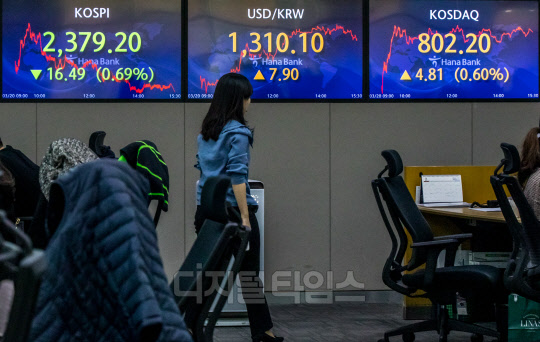 코스피가 전 거래일보다 16.49포인트 내린 2379.20로 장을 마친 20일 서울 중구 하나은행 딜링룸에서 직원들이 분주히 업무를 보고 있다. 이날 원·달러 환율은 7.9원 오른 1310.1원, 코스닥은 4.81포인트 오른 802.20로 마감했다.