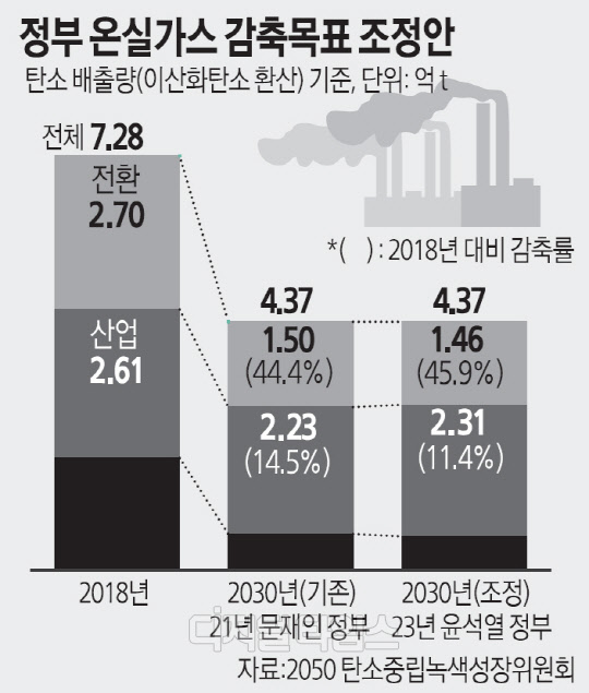 윤석열 정부가 2030 국가 온실가스 감축 목표(NDC) 달성을 위한 전략을 제시했다. 이전 정부가 만든 전환, 산업 등 부문별 감축목표에서 산업 분야의 목표를 하향 조정한 것이 특징이다.