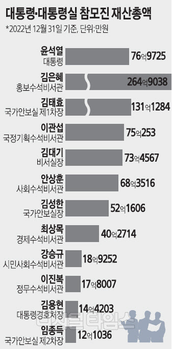 재산 규모로 보면 이원모 인사비서관이 443억9353만원으로 재산이 가장 많았고, 이어 김은혜 홍보수석이 264억9038만원, 김태효 국가안보실 제1차장이 131억1284만원 순으로 나타났다. 가장 재산이 적은 공직자는 김성섭 중소벤처비서관으로 -1억9635만원을 신고했다. 국무위원 중에는 이종호 과학기술정보통신부 장관이 148억7003만원으로, 가장 많았다. 이 장관은 은행, 보험 등 예금액이 종전 신고보다 11억5537만원 감소했다.