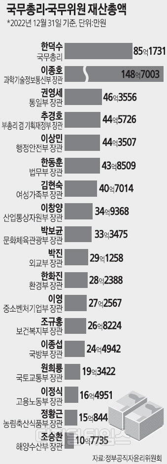 이영 중소벤처기업부 장관은 소유했던 상장주식을 전량 매도하면서 증권가액이 종전 신고보다 21억1131원 감소했고 예금액은 13억3886억원 늘었다. 이 장관의 전체 재산가액은 27억2567만원이다. 한덕수 국무총리의 재산은 85억1731만원으로 종전 신고보다 1640만원 늘었다.