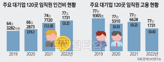 기업분석전문 한국CXO연구소는 12개 업종별 매출 상위 10개 기업의 사업보고서를 토대로 2019~2022년 인건비와 고용 현황을 분석했다고 30일 밝혔다. 대기업 120곳의 지난해 임직원 수는 77만2068명으로 2019년 이후 최소치를 기록했다. 전년의 77만6628명보다는 4560명 줄었다. 반면 임직원에게 지급하는 인건비 규모는 2019년 64조3282억원, 2020년 66조2873억원, 2021년 74조7720억원, 지난해 77조1731억원으로 꾸준히 늘었다.