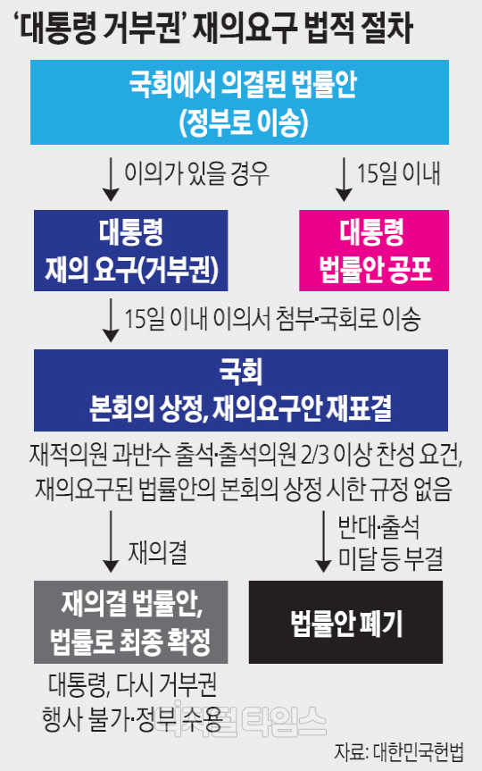 다수 의석을 앞세워 국회에서 법안들을 강행 처리하고 윤 대통령이 매번 거부권을 행사하는 구도가 이어질 가능성이 상당하다.