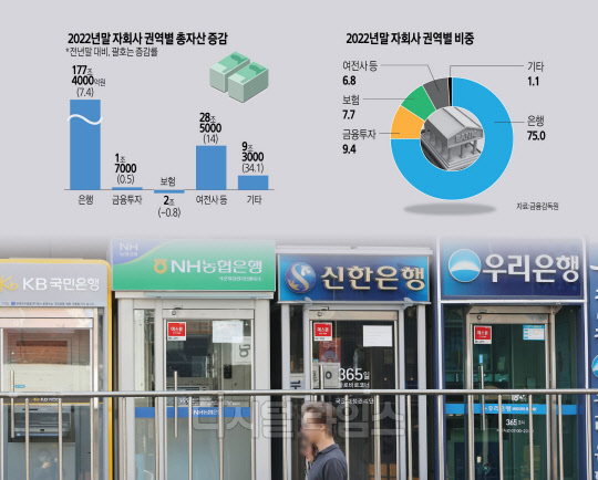 10개 금융지주의 연결총자산은 3418조2000억원으로 전년말(3203조3000억원) 대비 214조9000억원(6.7%) 증가했다. 자회사 권역별로는 은행 총자산이 177조4000억원(7.4%) 늘었고, 금융투자는 1조7000억원(0.5%), 여전사 등은 28조5000억원(14.0%) 각각 증가했다. 반면 보험은 총자산이 2조원(0.8%) 감소했다. 자회사 권역별 자산 비중은 은행이 75.0%로 전년 말(74.5%) 대비 0.5%포인트(p) 커졌다. 금융투자는 9.4%, 보험이 7.7%, 여전사 등이 6.8%를 차지했다.