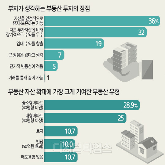 부자 중 29%는 그동안 거래 경험이 있었던 부동산 중 본인의 자산 확대에 가장 크게 기여했던 부동산 유형으로 중소형 아파트(40평형 미만)를 꼽았다. 대형 아파트(40평형 이상) 25%, 토지 11%, 빌딩(50억원 초과) 10%, 상가 5% 등의 순으로 나타났다. 부자의 절반 이상은 아파트가 부를 축적하는 데 가장 큰 도움이 됐다고 응답했다.