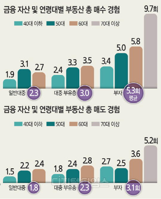 부자의 연령대별 부동산 매수 횟수를 보면 40대 이하는 3.4회, 50대는 5회, 60대는 5.8회로 각각 집계됐고, 70대 이상은 9.7회에 달했다.