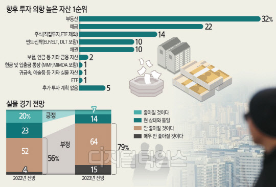 부동산 경기 침체 예상에도 불구하고 부자들은 향후 투자 의향이 높은 자산 1순위로 부동산(32%)을 꼽았다. 이어 예금(22%), 주식(14%), 펀드·신탁(10%), 채권(10%) 등의 순이다.
