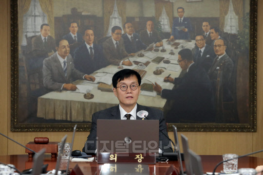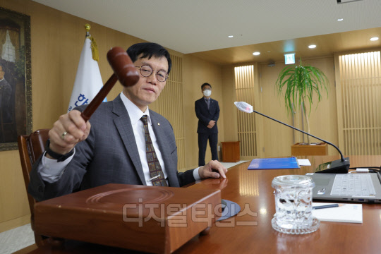 이창용 한국은행 총재가 11일 서울 중구 한국은행에서 열린 금융통화위원회에서 의사봉을 두드리고 있다.