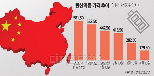 탄산리튬 가격은 중국 최대 배터리 업체인 CATL의 가격 인하 이후 하락세를 지속하고 있다. CATL은 향후 3년 동안 배터리 구매량의 80% 이상을 CATL에게서 공급받겠다는 약정을 조건으로, 탄산리튬을 기존의 반값 수준인 톤당 20만위안(약 3700만원) 수준으로 할인해 공급한다고 최근 밝힌 바 있다. 그 결과 한국자원정보서비스에 따르면 탄산리튬 가격은 지난 13일 기준 ㎏당 179.50위안으로 전월 평균 대비 32.35%, 전년 평균 대비 61.44% 떨어졌다.