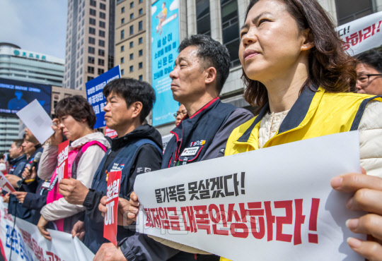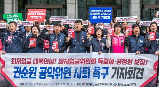 18일 서울 중구 한국프레스센터 앞에서 '최저임금 대폭 인상, 최저임금위원회 독립성ㆍ공정성 보장, 권순원 공익위원 사퇴 촉구 기자회견'이 열리고 있다.