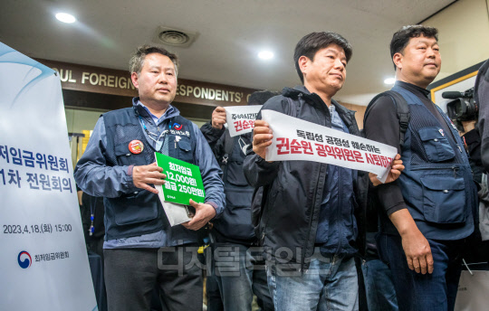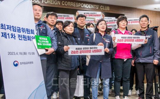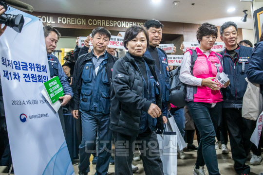 18일 오후 서울 중구 한국프레스센터에서 최저임금위원회 제1차 전원회의가 파행, 근로자위원 등이 회의장을 나서고 있다.