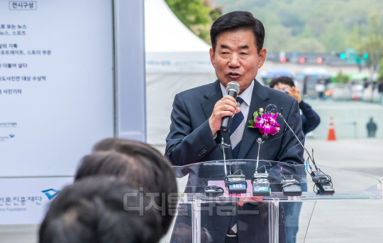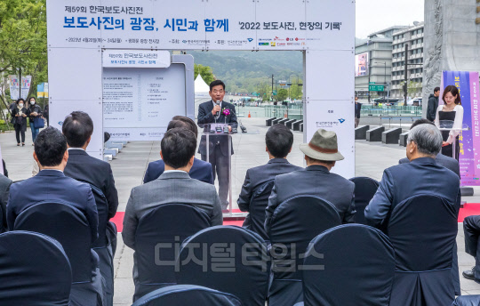 김진표 국회의장이 20일 서울 종로구 광화문광장에서 열린 제59회 한국보도사진전 개막식에서 축사하고 있다.