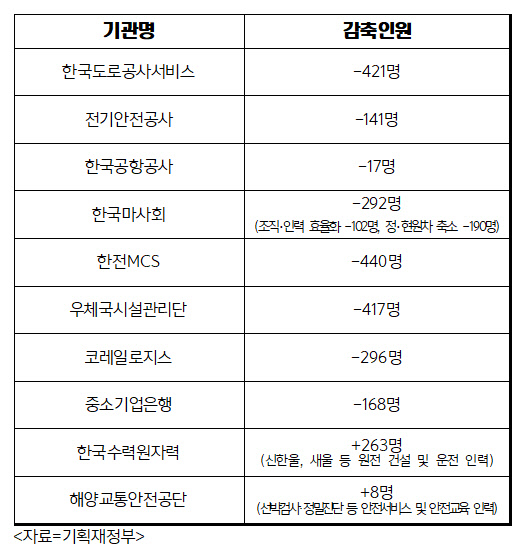 한국도로공사서비스는 통행료 정산기 확대 설치 등 무인·자동화시스템 도입에 따라 통행료 수납 기능이 축소하면서 421명을 줄였다. 한국마사회는 27개 지사 중 업무량이 적은 13개 지사 인력 102명을 감축했다. 핵심 국정과제·법령 제개정, 안전·필수시설 운영 등 필수소요 인력 4020명은 재배치됐다. 신한울, 새울 등 원전 건설·운전 인력 등 263명의 정원을 늘린 한국수력원자력이 대표적인 사례다.