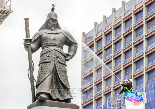 오세훈(왼쪽) 서울시장, 박경귀 아산시장이 25일 서울 광화문광장에서 이순신 장군 동상의 묵은 때와 먼지를 씻는 친수식을 하고 있다. 이날 진행된 친수식은 충무공 이순신 탄신 제478주년을 기념하기 위해 충남 아산 현충사 우물물을 길어와 동상을 물로 씻는 행사다.