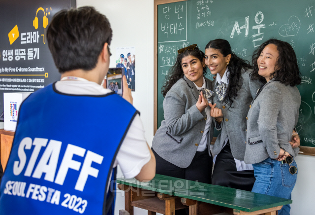 30일 서울 광화문광장에 마련된 '서울페스타 2023, 서울 컬처 스퀘어' 행사장에서 외국인 관광객들이 드라마 속 한국 교복을 입고 기념촬영을 하고 있다.
