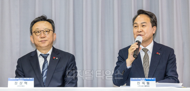 진옥동 신한금융그룹 회장이 2일 서울 중구 사회복지공동모금회에서 열린 보이스피싱 피해자 지원 및 예방사업을 위한 업무협약식에서 인사말을 하고 있다. 왼쪽은 정상혁 신한은행장.