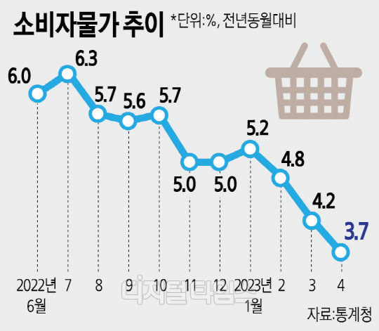 물가 상승률이 3%대로 둔화한 것은 지난해 2월(3.7%) 이후 처음이다. 소비자물가 상승률은 지난해 7월(6.3%) 정점을 찍은 이후 8월(5.7%), 9월(5.6%), 10월(5.7%), 11월(5.0%), 12월(5.0%), 올해 1월(5.2%)까지 5%대 물가를 이어갔다. 이후 2월(4.8%), 3월(4.2%) 4%대로 하락세를 보였다.