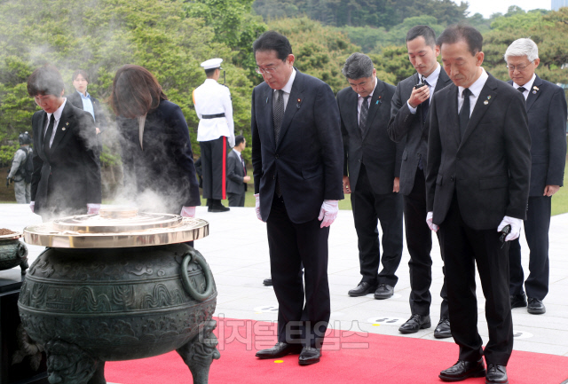 한일 정상회담을 위해 방한한 기시다 후미오 일본 총리가 7일 서울 동작구 국립서울현충원에서 현충원 참배를 하고 있다. 사진공동취재단