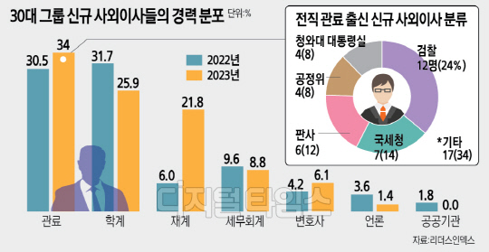 9일 기업분석연구소 리더스인덱스가 국내 30대 그룹 중 사업보고서를 제출하는 219개 기업의 신규 사외이사 147명의 이력을 조사한 결과, 관료 출신이 50명으로 가장 많았다. 관료 출신 비중은 지난해(30.5%)보다 3.5% 포인트 상승한 것이다. 반면 지난해 31.7%로 가장 높은 비중을 차지했던 올해 25.9%(38명)으로 5.8% 감소했다.