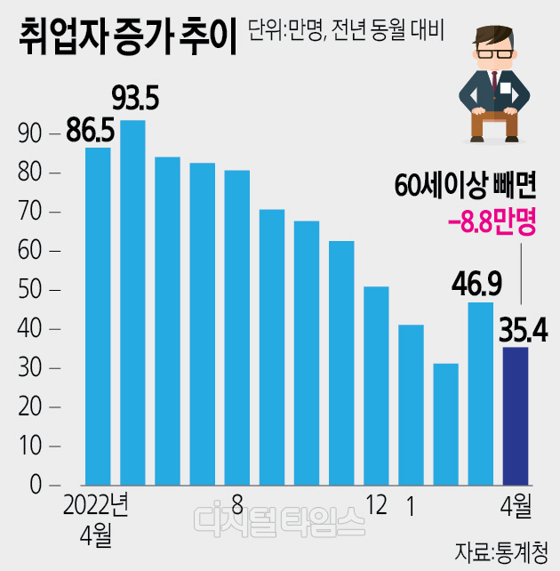 지난 4월 취업자 수는 외부 활동과 돌봄 수요 증가에 힘입어 1년 전보다 35만4000명 늘었다. 하지만 수출 감소로 제조업 취업자 급감했다.