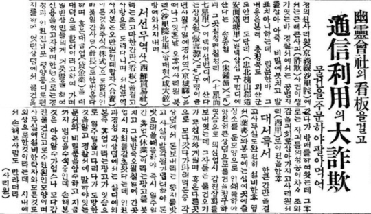 1923년 6월 1일자 동아일보 지면에도 비슷한 기사가 보인다. '유령회사의 간판을 걸고 통신을 이용한 대 사기'라는 제목의 기사다. "경의선 사리원에서는 근래 큰 사기 사건이 생겼는 바, 송종철(宋鍾喆·28)과 장길원(張吉源·27) 등 2명이 금년 4월 9일에 사리원에 와서 지내며 서선무역사(西鮮貿易社)라는 조그마한 간판을 걸고 (중략) 자기들의 성공이 차차 좋아감을 기회로 삼아 가지고 (중략) 대서특서(大書特書)한 간판을 걸고 사무실도 완전히 설비한 후 엽서와 봉투에는 10여 곳에 출장소를 둔 모양으로 인쇄를 하여 큰 상점으로 물건을 청구하였으므로 의심 없이 값진 잡화를 보내었는데 그 자들은 물건이 오기가 무섭게 싸게 팔며 혹은 다른 곳으로 모두 갔다가 팔아먹던 중 (중략) 손해 본 것은 아직 알 수가 없으나 모두 값진 물건인 고로 수천원인 모양이며 사무실에 설비한 탁자와 모든 것도 외상으로 한 것이라는데 시내에서 손해 본 사람도 많다더라."