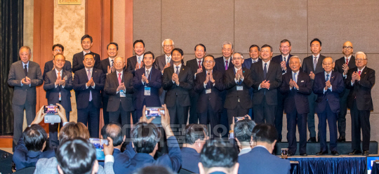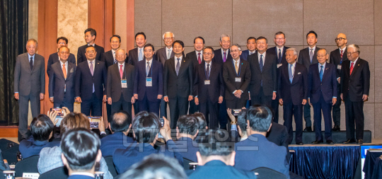 16일 서울 중구 롯데호텔에서 4년 만에 대면으로 열린 55회 한일경제인회의에서 양국 인사들이 기념촬영을 하고 있다. 맨앞줄 왼쪽 세번째부터 구자열 한국무역협회장, 손경식 한국경영자총협회장, 김윤 한일경제협회장, 안덕근 산업통상자원부 통상교섭본부장, 사사키 미키오 일한경제협회장, 아이보시 고이치 주한일본대사, 사이키 아키타카 미쓰비시상사 이사.