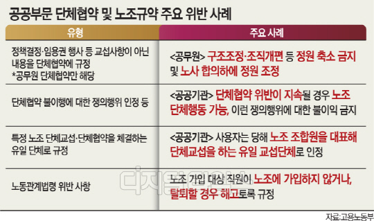 고용노동부는 17일 올해 3월부터 실시한 공공부문 단체협약과 노동조합 규약 실태 확인 결과, 479개 기관의 단체협약 중 179개 기관(37.4%)의 단체협약에서 관계법령을 위반해 불법, 무효로 판단되는 내용들이 포함됐다고 밝혔다. 노조와 조합원에 대한 불공정한 특혜, 인사·경영권 침해 등 내용이 포함된 단체협약도 135개 기관(28.2%)으로 파악됐다. 이정식 고용부 장관은 "공무원의 경우 법에 단체협약으로 정할 수 없는 내용을 정하고 있음에도 노사가 이를 협정으로 체결하는 불법 사례가 많았다"고 말했다. 구조조정·조직개편을 이유로 기관 정원의 축소 금지 또는 노사 합의로 정원을 조정하거나 인사위원회에 노조 추천 외부인사를 포함토록 하는 경우와 성과상여금을 집행하기 전에 노조와 합의하도록 하는 내용 등이 대표적 사례다. 공무원·교원 노사는 법령에 반해 단체협약을 체결하는 경우도 있었다. 단체협약의 내용이 조례·규칙보다 유리한 경우 단체협약 내용에 맞춰 조례·규칙을 제·개정하거나, 단체협약에서 정한 기준이 노동관계법령보다 우선한다는 규정 등이다.정석준기자 mp1256@