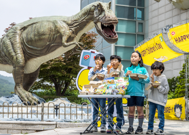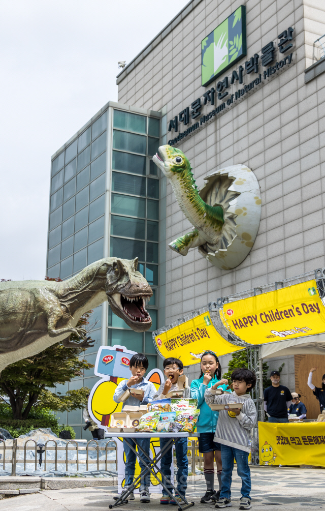 21일 서울 서대문자연사박물관에서 열린 종합식품기업 하림 '용가리 간식상자' 선물 행사에서 어린이들이 다양한 용가리 제품을 맛볼 수 있는 용가리 간식상자를 소개하고 있다. 하림은 가정의 달을 맞아 서대문자연사박물관에서 주말 동안 용가리 치킨, 용가리 땡, 용가리 만두와 과일 등으로 구성된 '용가리 간식상자'를 어린이 동반 가족 1,500명에게 무료로 증정한다.