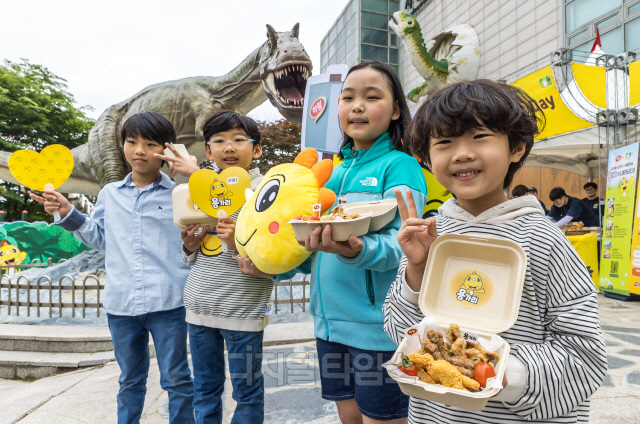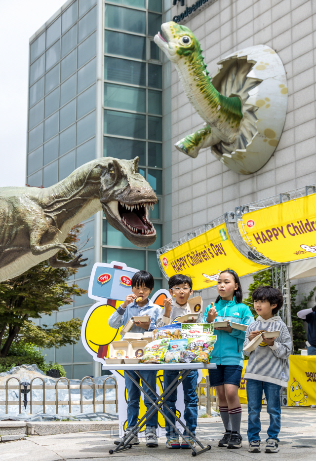 21일 서울 서대문자연사박물관에서 열린 종합식품기업 하림 '용가리 간식상자' 선물 행사에서 어린이들이 다양한 용가리 제품을 맛볼 수 있는 용가리 간식상자를 소개하고 있다. 하림은 가정의 달을 맞아 서대문자연사박물관에서 주말 동안 용가리 치킨, 용가리 땡, 용가리 만두와 과일 등으로 구성된 '용가리 간식상자'를 어린이 동반 가족 1,500명에게 무료로 증정한다.
