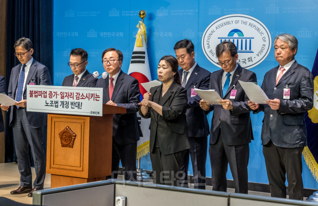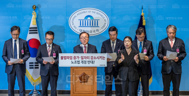 이동근 한국경영자총협회 상근부회장이 23일 서울 여의도 국회 소통관에서 노동조합법 개정안 본회의 상정 중단을 촉구하는 경제6단체 공동성명을 발표하고 있다. 뒷줄 왼쪽부터 한무경 국민의힘 의원, 강석구 대한상공회의소 조사본부장, 이호준 한국중견기업연합회 상근부회장, 이동근 경총 상근부회장, 김고현 한국무역협회 전무, 이명로 중소기업중앙회 인력정책본부장, 배상근 전국경제인연합회 전무.
