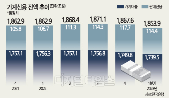 한국은행이 23일 발표한 '2023년 1분기 가계신용(잠정)' 통계에 따르면 지난 3월 말 기준 가계신용 잔액은 1853조9000억원으로 지난해 4분기(12월 말 기준 1867조원)보다 13조7000억원 줄었다.