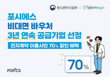 자사 전자계약 서비스 70% 할인 전자문서 및 전자계약 솔루션 전문기업 포시에스는 3년 연속 중소벤처기업부 '비대면 바우처' 사업 공급기업에 선정, 자사 전자계약 서비스 '이폼사인(eformsign)' 이용 요금을 70% 할인해 준다고 밝혔다. 포시에스는 중소기업의 디지털 전환 및 비대면 업무 환경 도입을 지원하기 위해, 비대면 바우처 수요기업 신청 및 효율적인 바우처 사용을 위한 무료 컨설팅을 진행 중이다. 수요기업 신청은 총 3차에 걸쳐 진행되며, 1차 모집은 6월 8일 마감된다. 단, 예산 소진 시 조기 마감되거나 다음 차수 신청이 생략될 수 있다.
