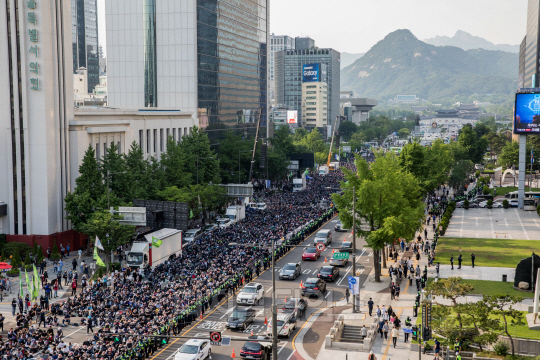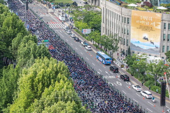 민주노총 조합원들이 31일 서울 세종대로에서 노동·민생·민주·평화 파괴 윤석열 정권퇴진! 민주노총 총력투쟁대회를 하고 있다.