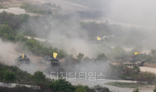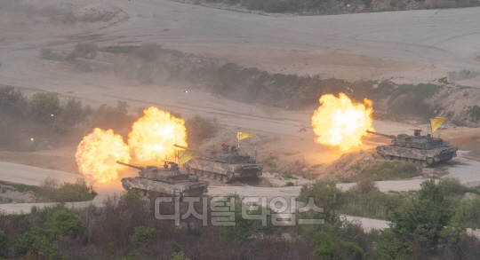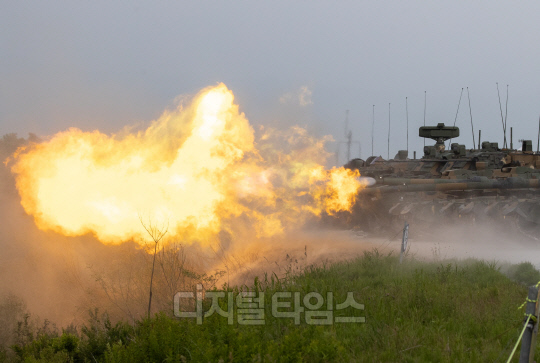 7일 오후 경기 포천시 승진과학화훈련에서 열린 2023 연합·합동 화력 격멸훈련에서 K2전차가 사격 시범을 보이고 있다.