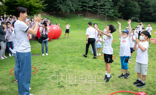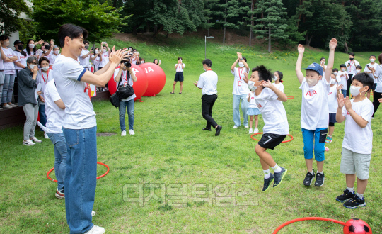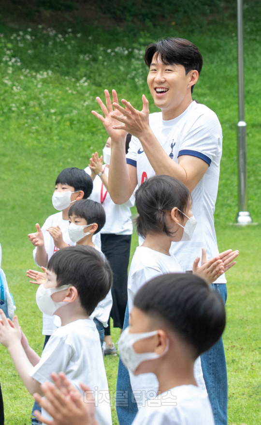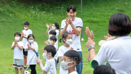 4일 서울 동대문구 글로벌지식협력단지에서 열린 'AIA생명 손별 모아 Wish' 행사에서 소아암 어린이들이 손흥민이 등장하자 기뻐하고 있다.
