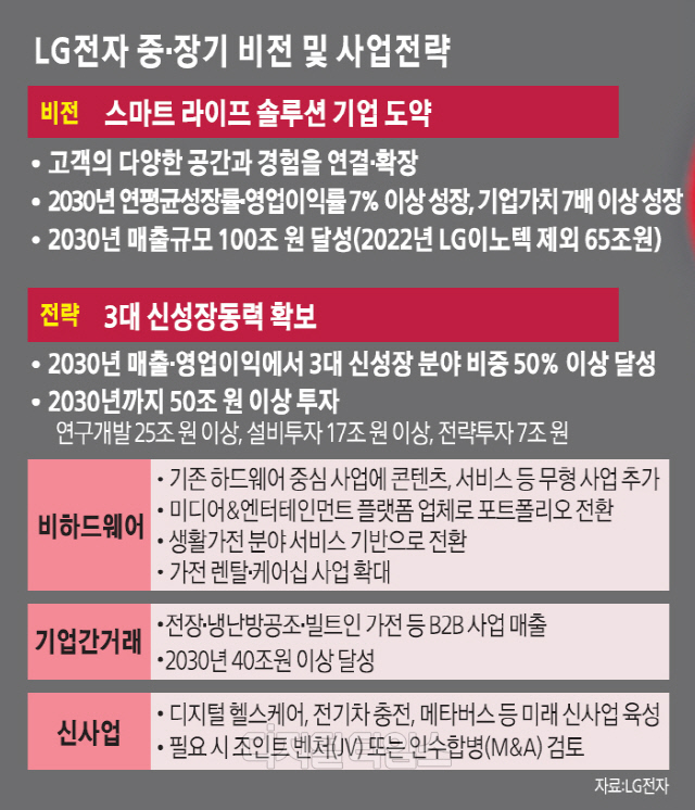지난 2013년 '글로벌 가전 1위'를 목표로 내세웠던 LG전자가 10년이 지난 올해 가전을 뛰어넘는 '스마트 라이프 솔루션 기업'으로 변화하겠다는 장기 비전을 발표했다. 가전과 TV 등 기존 세트 사업뿐 아니라 서비스·콘텐츠, B2B(기업 간 거래), 신성장 사업 중심의 사업 포트폴리오를 구성해 오는 2030년까지 연매출 100조원을 달성하는 회사로 성장하겠다는 전략이다.