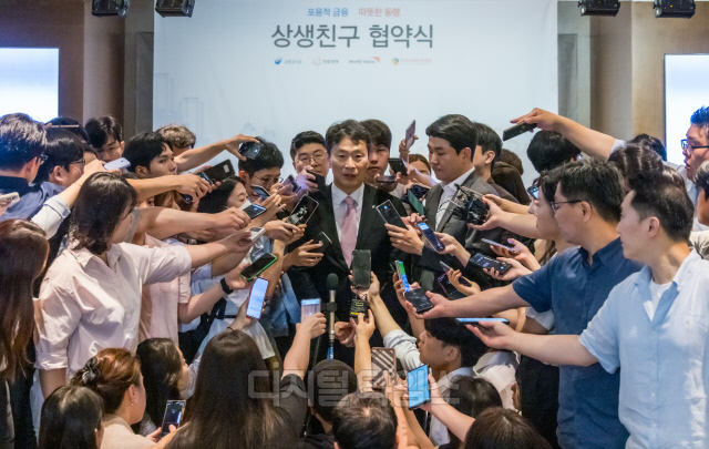 이복현 금융감독원장이 13일 서울 여의도 63빌딩에서 포용적 금융·따뜻한 동행 상생친구 협약식을 마친 뒤 취재진 질문에 답하고 있다.