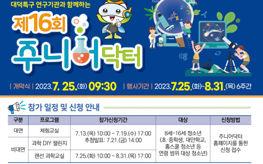 대덕특구를 대표하는 청소년 과학체험 프로그램인 '주니어닥터'는 전국의 청소년을 대상으로 과학자들과 함께 매년 여름방학 동안 진행된다.