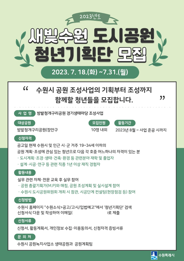수원특례시는 '밤밭청개구리공원 경기생태마당 조성사업'에 참여할 '새빛수원 도시공원 청년기획단'을 오는 31일까지 모집한다고 18일 밝혔다.