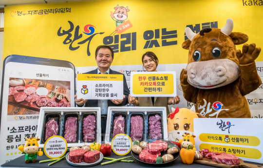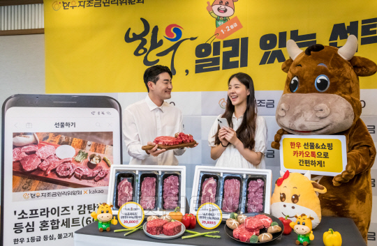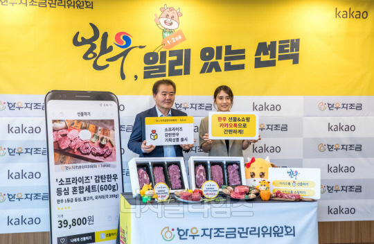 26일 서울 중구 프레스센터에서 열린 '한우, 일리 있는 선택' 캠페인 홍보행사에서 이동활 한우자조금관리위원장과 김미희 카카오 커머스시행팀장이 기념촬영을 하고 있다. 한우자조금과 카카오는 온라인 한우 소비 확대를 위해 카카오톡에서 선물·쇼핑이 가능한 '소프라이즈' 감탄한우 기획 상품을 출시했다.