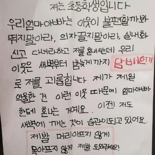 해당 글을 보면 '저는 초등학생'이라고 밝힌 글쓴이는 "우리 엄마 아빠는 이웃이 불편할까봐 뛰지말아라, 의자 끌지 말아라. 실내화 신고 다녀라 하고 저를 혼내시는데, 우리 이웃은 새벽부터 밤늦게까지 담배연기로 저를 괴롭힌다"면서 "제가 제일 억울한 건 이런 이웃 때문에 엄마아빠한테 혼 나는 것"이라고 호소했다.